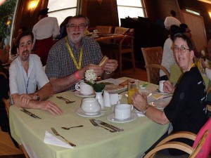 Ricardo Portillo, Alejandro Garavano y Gloria Puuw, desayunando el 29 de marzo (todos socios AAMCANT)